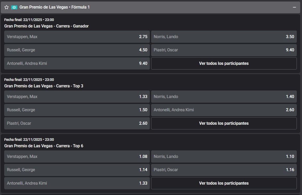 GP de Las Vegas 2025 en Fórmula 1: pronósticos y cuotas