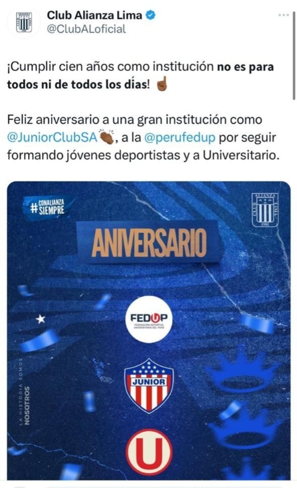 El mensaje de felicitación incluyó a Junior de Barranquilla, equipo colombiano que también cumple 100 años. La felicitación estuvo acompañada de adjetivos como “gran institución”. Además, el cuadro victoriano aprovechó para saludar a la Federación de Estudiantes del Perú con un “por seguir formando jóvenes deportistas”.