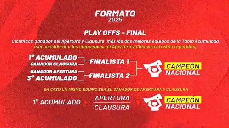 Si equipos diferentes ganan los torneos cortos, o sea Apertura y Clausura, estos deben quedar entre los ocho primeros del acumulado para acceder a los Play-Offs. De lo contrario, no clasificarán a las semifinales. Estos dos ganadores se medirán con los mejores posicionados del acumulado en llaves de ida y vuelta para definir a los finalistas. Las localías las define el equipo con mejor posicionado en la tabla.