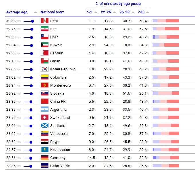 El rango etareo que más destaca en la clasificación de Perú es que más del 50% del equipo están por encima de los 30 años y que más del 30% se encuentra entre los 26 a 30 años. La selección peruana es una de las tres selecciones del listado en donde más del 50% de los jugadores son mayores de 30 años, junto a Iran (segundo puesto) y Kuwait (cuarto puesto).