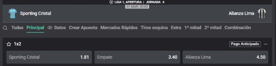 Por la cuarta fecha del Torneo Apertura de la Liga 1, Sporting Cristal recibirá a Alianza Lima en el Estadio Nacional. El cuadro celeste marcha en la cuarta posición con 7 puntos; mientras que los blanquiazules son sextos con 6 unidades. A continuación, conoce toda la información para apostar con las cuotas que te trae Atlantic City.