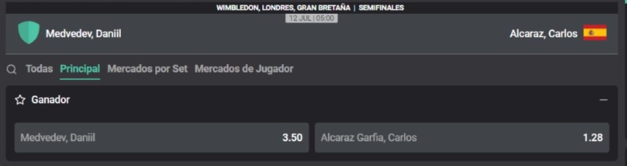 Wimbledon ya conoce a los cuatro mejores jugadores del torneo. Carlos Alcaraz y Daniil Medvedev disputarán el séptimo encuentro entre ambos por un pase a la final del Grand Slam londinense. Daniil mandó a casa a Jannik Sinner, número uno del mundo; mientras que Carlitos apeó a Tommy Paul, quien lo sorprendió al ganar el primer set. A continuación, conoce toda la información para apostar con las cuotas que te trae Atlantic City.
