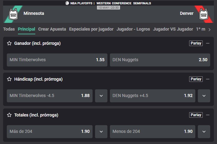 Se disputan los Play Offs de la NBA entre los Nuggets y los Timberwolves. Apuesta y juega en Atlantic City que trae las mejores cuotas.