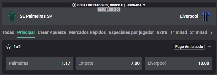 Palmeiras vs. Liverpool (U). Por la fecha 2 de la Copa Libertadores, Palmeiras recibe al Liverpool de Uruguay por la segunda fecha del Grupo F. A continuación, conoce las cuotas que trae Atlantic City y toda la información para realizar la mejor apuesta.
