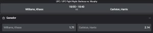Khaos Williams tendrá su tercera pelea en los últimos 3 años, pues solo compitió una vez en 2022 y otra en 2023. El estadounidense tiene un récord de 14-3 en toda su carrera, y su último combate fue una victoria ante el peruano Rolando Bedoya en el UFC 288, en setiembre del año pasado. Por su parte, Carlston Harris tiene un récord similar, con 19-5. Se impuso en las dos peleas que tuvo durante 2023, aunque sufrió en los primeros asaltos y tuvo que remontar para hacerse con la victoria.